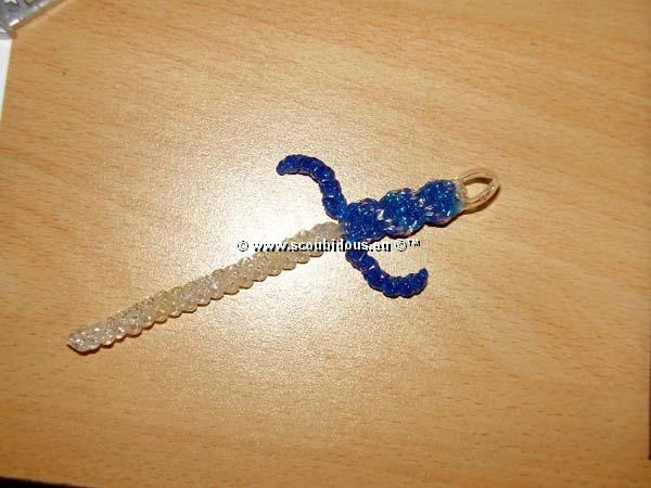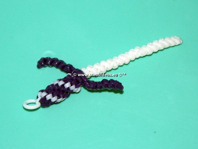 3/ Ensuite, uniquement avec les 2 brins blanc, faites un scoubidou en maille papillon