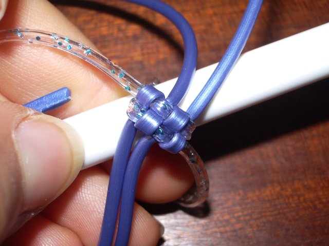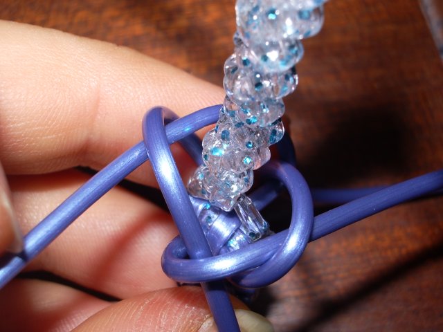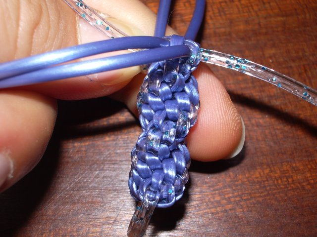 4/ Avec les 4 brins bleu, faites un rang de scoubidou 4 brins torsadé.