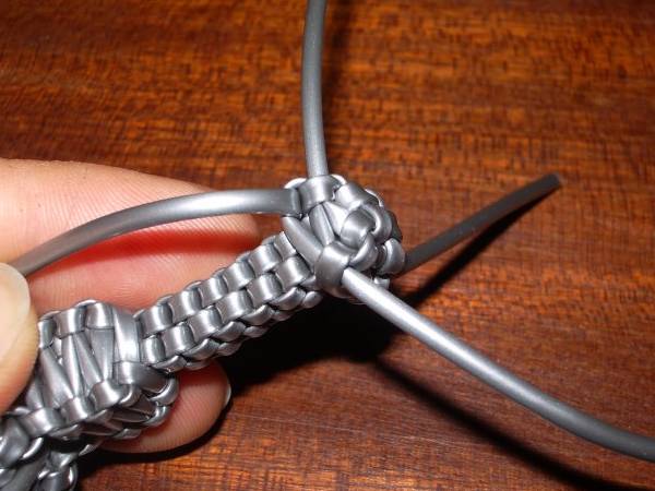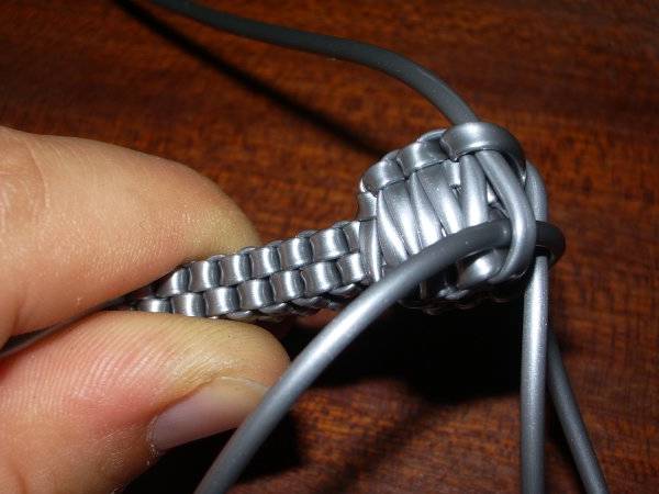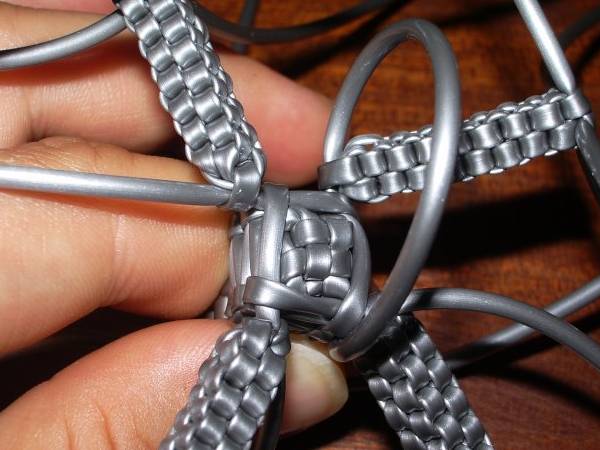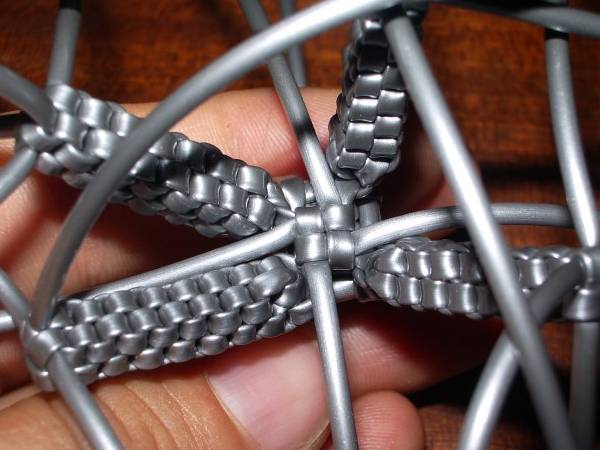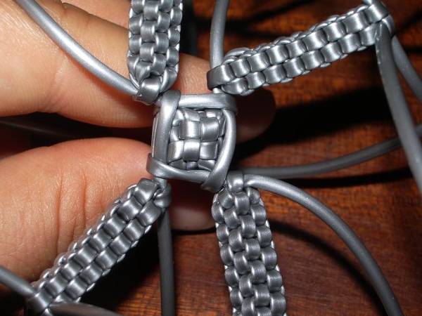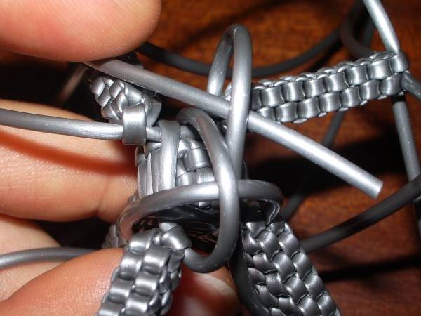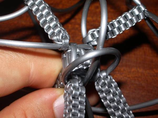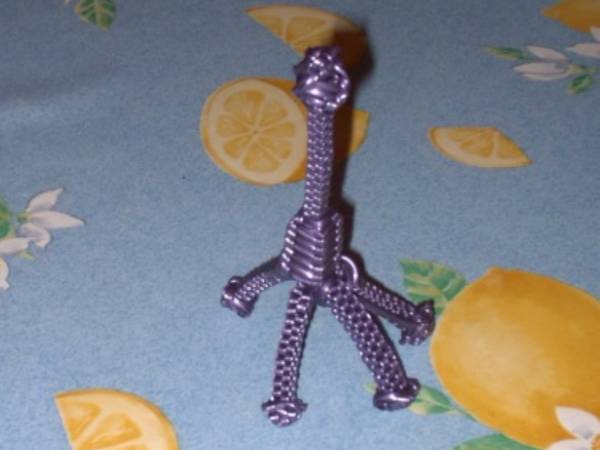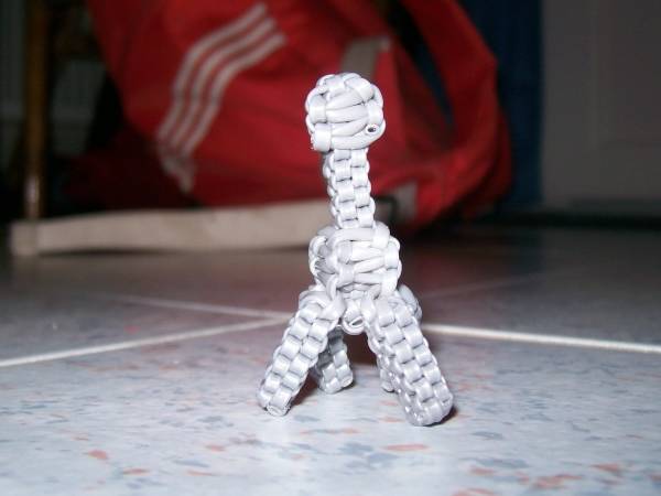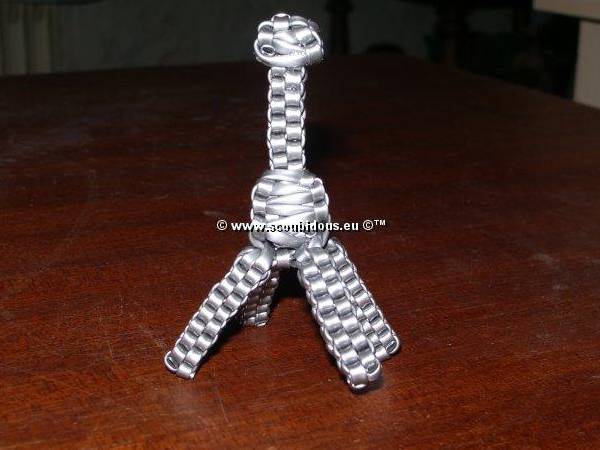 La Tour Eiffel (Julie)© Les tutoriaux, photographies et schémas ne sont pas libres de droits **************************** Matériel6 fils de scoubidou de même couleur et qu’on coupera en deux (donc 12 demi-fils). Techniques utilisées4 brins droit 1 - Prendre 4 demi-fils et faire un nœud à 7cm de longueur. 2 - Faire un scoubidou droit à 4 brins sur 22 rangs. 3 - Faire 6 mailles de la technique de la bouteille par dessus le scoubidou. 4 - Puis refaire une bouteille par dessus la première sur 5 rangs 5 - Prendre 2 demi-fils et faire un nœud avec l’un des deux sur le deuxième. 6 - Passer dans le noeud un des brins de la première moitié 7 - Placer les nouveaux brins tout contre la double bouteille. 8 - Faire un scoubidou droit à 4 brins sur 15 rangs. 9 - On refait pareil avec les autres demi-fils et à chaque fois Voilà ce qu'on obtient au final : 10 - Pour consolider le tout : retourner la Tour Eiffel… … et faire un rang avec les 4 brins de la double bouteille : Bien serrer et refaire un 2ème rang pour que tout tienne bien : 11 - On défait le noeud provisoire qu'on avait fait au début de la Tour Eiffel et, sur le début du scoubidou de départ, utiliser la technique de la bouteille sur 2-3rangs. 12 - Il ne reste plus qu'à mettre un peu de colle et à couper tous les fils ! C'est fini ! Exemples de scoubidous réalisés par les membres : |